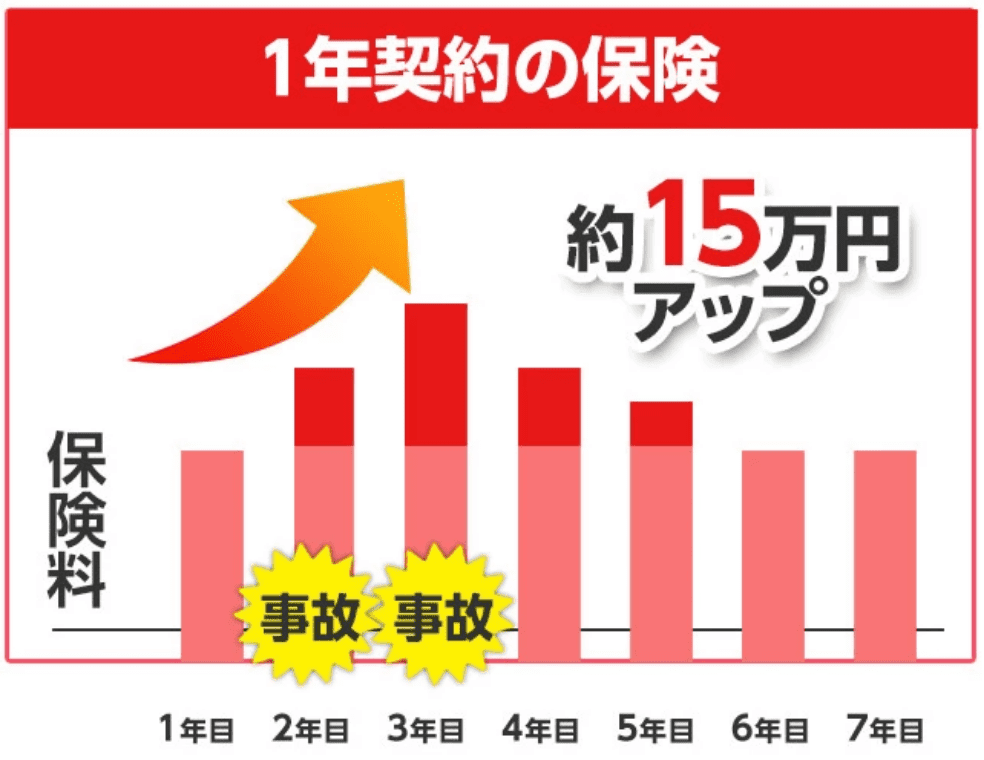 通常の保険では、事故を起こせば等級が下がって保険料が上がります。(2013年3月31日以降の契約の場合)
